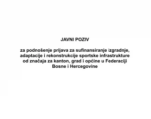 Aktuelnosti B JAVNI POZIV za podnošenje prijava za sufinansiranje izgradnje, adaptacije i rekonstrukcije sportske infrastrukture od značaja za kanton, grad i općine u Federaciji Bosne i Hercegovine Pročitaj više » 4 Marta, 2025