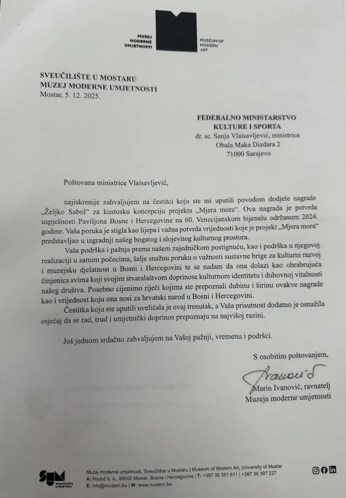 I sincerely thank you for the congratulatory message you sent me on the occasion of receiving the “Željko Sabol” Award for the curatorial concept of the project “Measure of the Sea.” This award is a confirmation of the success of the Pavilion of Bosnia and Herzegovina at the 60th Venice Biennale, held in 2024. Your message arrived as a beautiful and important acknowledgment of the values that the project “Measure of the Sea” represented in building our rich and layered cultural space.