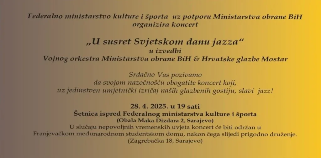 Federalno ministarstvo kulture i sporta u saradnji s Ministarstvom odbrane Bosne i Hercegovine jazz koncertom će obilježiti Svjetski dan jazza
