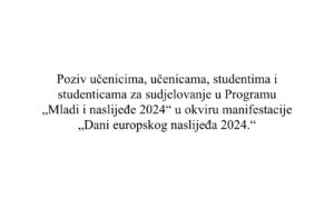 Aktuelnosti H Poziv učenicima, učenicama, studentima i studenticama za sudjelovanje u Programu „Mladi i naslijeđe 2024“ u okviru manifestacije „Dani europskog naslijeđa 2024.“ Pročitaj više » 13 svibnja, 2024