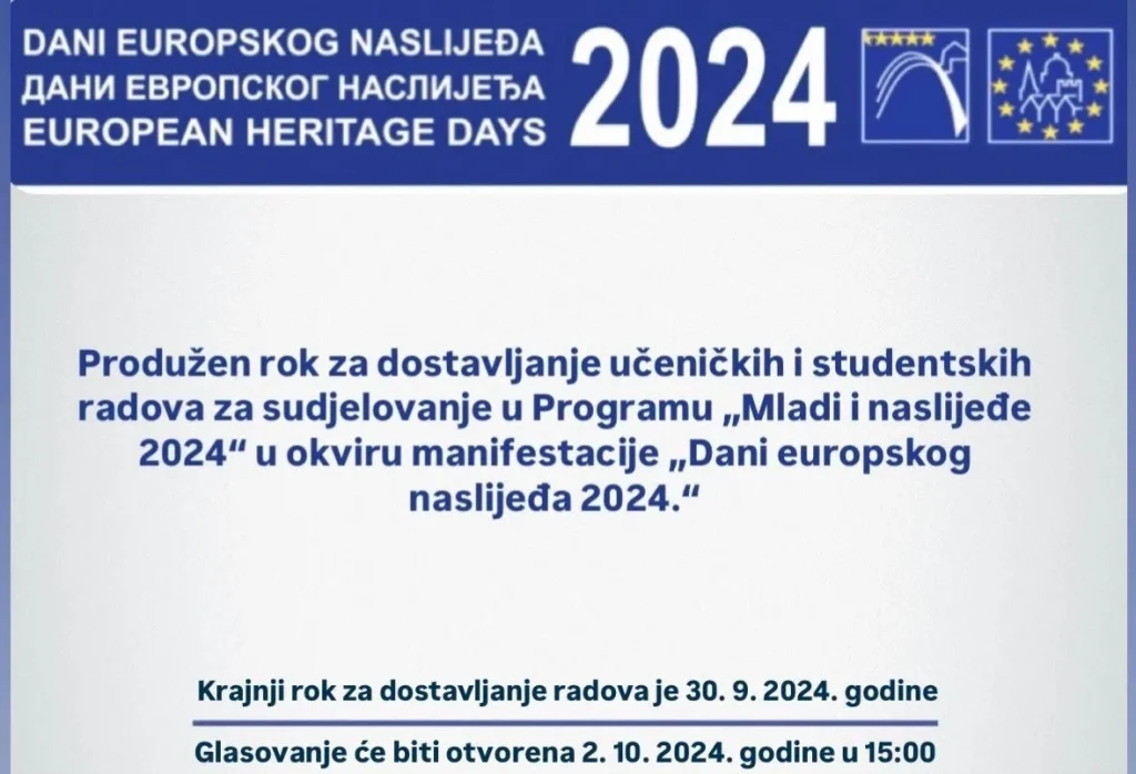 Produžen rok za dostavljanje učeničkih i studentskih radova za program „Mladi i naslijeđe 2024“: Krajnji rok za dostavljanje radova je 30. 9., a glasanje će biti otvoreno 2. 10. 2024. godine