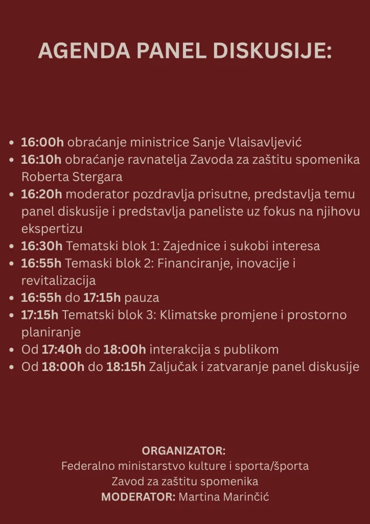 Pozivamo vas da nam se pridružite na panel diskusiji ”Održivo upravljanje kulturnom baštinom: Izazovi i rješenja”, koja okuplja stručnjake, predstavnike institucija, lokalne zajednice, studente i entuzijaste s ciljem razmjene znanja i inovativnih pristupa u očuvanju, promociji i održivom korištenju kulturne baštine.