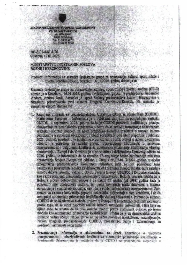 Састанак извјештајне групе за образовање, културу, спорт, младе и околиш (ГР-Ц) одржан је у Стразбуру, 16. јануара 2026. године. Извјештајном групом предсједавао је амбасадор Андоре, Андреу Јорди. Састанку је испред Сталног представништва Босне и Херцеговине у Стразбуру присуствовала прва секретарица Драгана Кременовић-Кусмук. На састанку је разматран дневни ред кроз шест тачака, при чему се точка 6. односила на спорт.