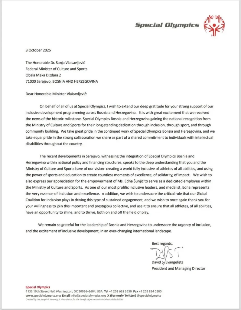Предсједник и директор Специјалне олимпијаде за Европу и Есроазију, Давид Евангелиста, упутио је писмо захвале федералној министрици културе и шпорта, Сањи Влаисављевић, након што је примио вијест о потписивању историјског Споразума о сарадњи између Специјалне олимпијаде БиХ и Федералног министарства културе и спорта.