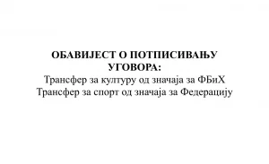 Naslovna S ОБАВИЈЕСТ О ПОТПИСИВАЊУ УГОВОРА: Трансфер за културу од значаја за ФБиХ и Трансфер за спорт од значаја за Федерацију Pročitaj više » август 19, 2024