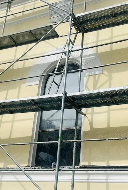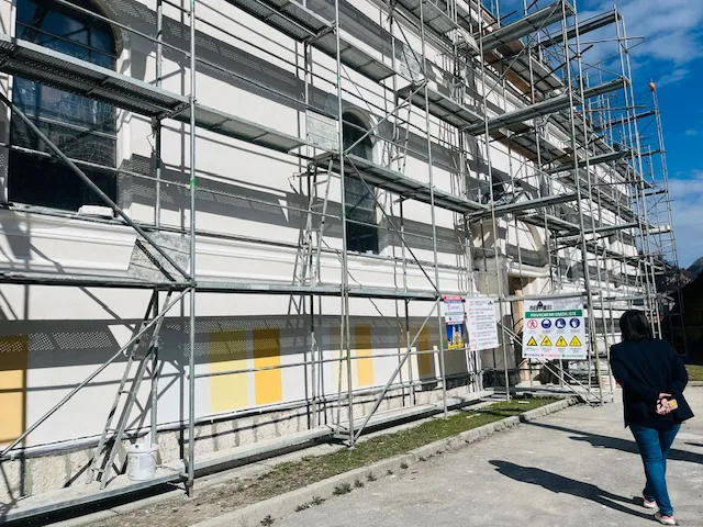 Nakon pripremnih radova na jugoistočnoj fasadi pristupilo se nanošenju završnog sloja caparol boje. Osnovna boja za ravne površine je svijetli ton proizvođača Caparol (spravljena prema uzorku STO 32114). Dekorativna plastika – vijenci koji su se ručno izvlačili na licu mjesta, uz pomoć šablona su u bijeloj boji (caparol spravljeno prema uzorku STO 16002). Istaknuti dijelovi fasade boje se u tamniji ton (caparol spravljeno prema uzorku STO 32112). Radovi na sjeveroistočnoj fasadi su spremni za nošenje završnog sloja boje prema datim shemama.