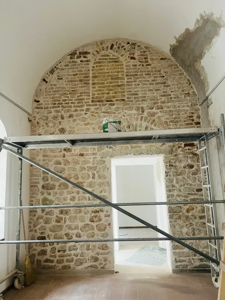 Nakon izvršenog uvida u izvedene radove utvrđeno je da su završeni radovi na obradi špaleta sa kojih su uklonjena vrata, obijeni svi nestabilni dijelovi maltera sa zidova te završeni radovi na uklanjanju maltera sa jednog poprečnog zida za koji je ranije odlučeno da ostane otkriven, bez maltera. Nakon uklonjenog maltera, vršeno je obijanje postojećih fuga i čišćenje zida. Zid je zidan u kombinaciji opeke i kamena, donja zona je od kamena, a gornja od opeke. Izvršeno je ponovno fugiranje malterom na bazi kreča, nakon čega će zid biti zaštićen zaštitnim premazom u dva sloja.